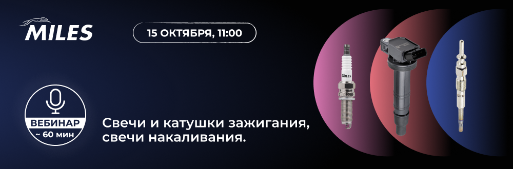 Приглашаем вас принять участие в вебинаре, посвященном свечам и катушкам зажигания, а также свечам накаливания MILES. Вас ждет прямой эфир на наших официальных каналах: Rutube, YouTube и ВКонтакте.